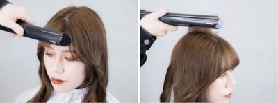 ストレートアイロンを使い、前髪を軽くワンカール。トップの毛束を持ち上げるようにアイロンを通し、根元に立ち上げをつける。ヘアオイルを手ぐしでなじませて完成。