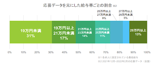 「19万円未満」の割合が31%と最も⾼く、次いで「19万円以上21万円未満」の割合が⾼いという結果になっています。また、19万円から25万円までの給与帯が全体の70%以上を占めています。