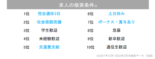 「完全週休2⽇」や「⼟⽇休み」など、休⽇に関する条件が⼈気であることが分かります。また「社会保険完備」や「交通費⽀給」、「ボーナス・賞与あり」など、福利厚⽣関連の条件も⼈気なことが分かります。