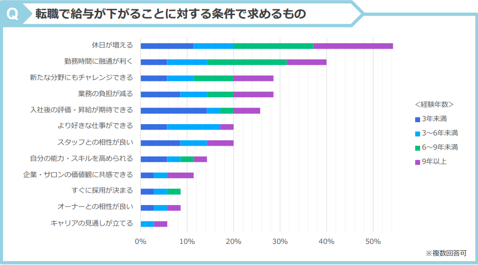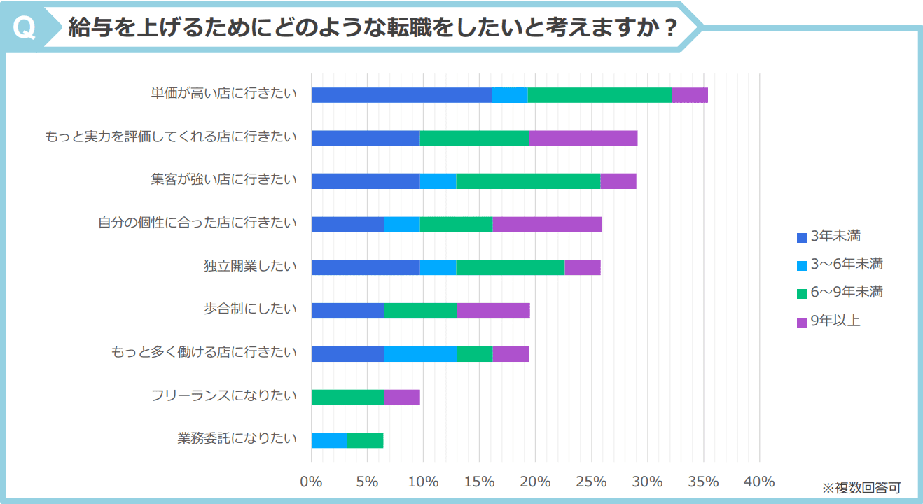 「単価が⾼い店に⾏きたい」回答した割合が35%と最も多い結果となりました。経験年数別で⾒ると、6〜9年未満は「集客が強い店に⾏きたい」も同様に多く、9年以上は「もっと実⼒を評価してくれる店に⾏きたい」「⾃分の個性に合った店に⾏きたい」が多い結果となりました。