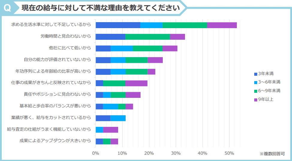 また6~9年未満の方と、9年以上の方が、「仕事の成果がきちんと反映されていないから」と回答した人の割合が高いことも見て取れます。