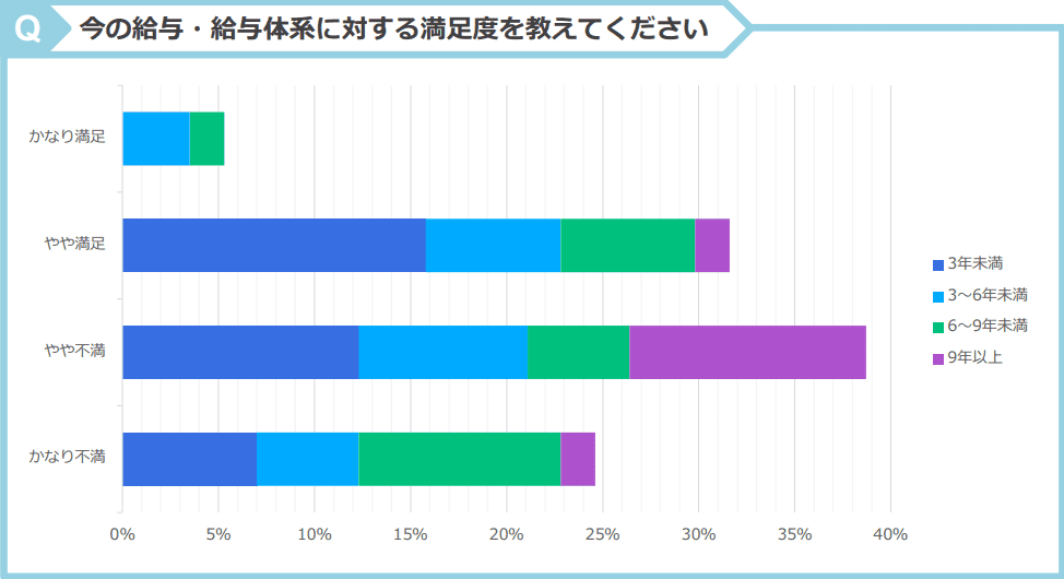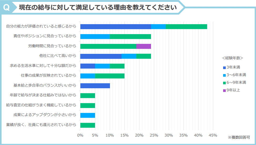満足な理由として最も多かった回答は「自分の能力が評価されていると感じるから」43%という結果になりました。経験年数別で見ると、3年未満が半分以上を占めていることが分かります。6~9年以上は「労働時間に見合っているから」が最も多い結果となりました。