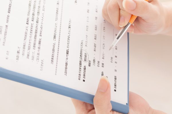 エステサロンでの施術では、エステの効果を向上させるために、ふだんの睡眠時間や運動時間、食生活や好きな食べ物、お酒やタバコについても記入してもらいます。
