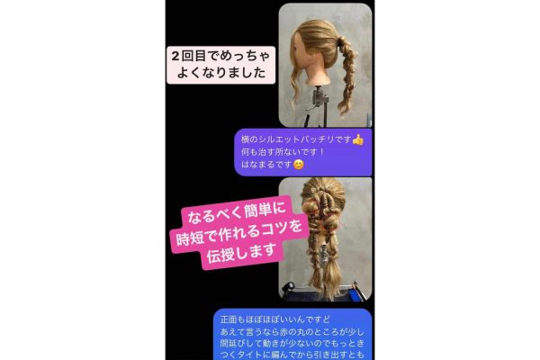 リクエストのあったスタイルをすぐにライブ配信したり、個別でLINEを返したり、ヘアセットサロンに15年以上勤めて培った技術をこれだけ個人に寄り添って提供できるのは僕のスクールだけだと思います。ほとんどの方がサロンワークの合間にオンラインスクールを運営しているのに対し、僕はオンラインスクールメインで仕事をしているため、圧倒的に時間を割くことができるんです。