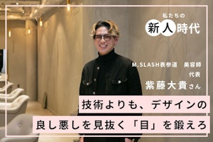 表参道のヘアサロン「M.SLASH表参道」の代表を務めながら、プレイヤーとしても活躍する紫藤大貴さん。2023年にはJHA(ジャパン・ヘアドレッシング・アワーズ)優秀新人賞を受賞している実力の持ち主です。この企画では、美容師は新人時代になにをするの?デビューはどのように決まるの?新人時代の動きや挫折しやすいポイントは?といったみなさんの疑問についてお聞きします。