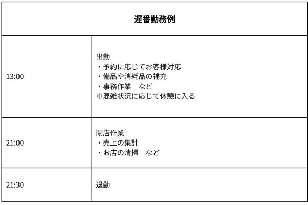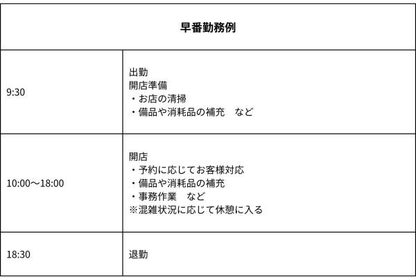 1日の業務の流れは以下の通りです。サロンによって異なるため参考程度にしてください。