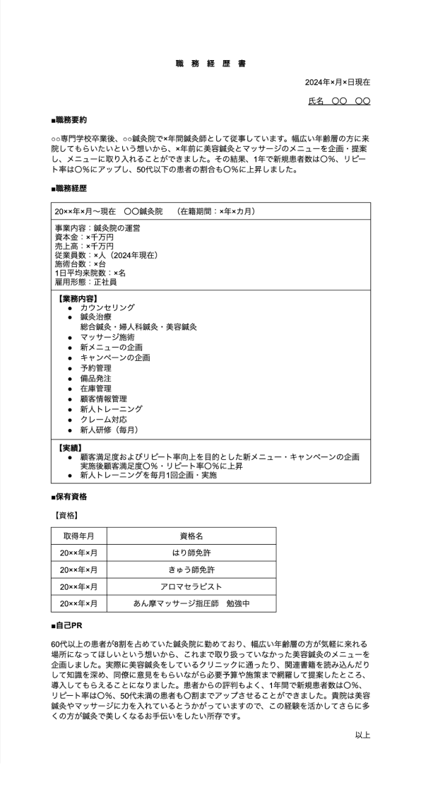 ここまでお伝えしたポイントを踏まえて、鍼灸師の職務経歴書の見本を紹介します。