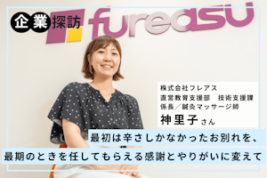 後編は現場で働くスタッフのおひとりであり、技術支援課の係長としてスタッフの研修も担当する神里子(じん・さとこ)さんにお話しを伺います。前職で訪問の仕事を経験し、その魅力を感じたことから、訪問鍼灸マッサージの大手である「フレアス」への転職を決めたそうです。