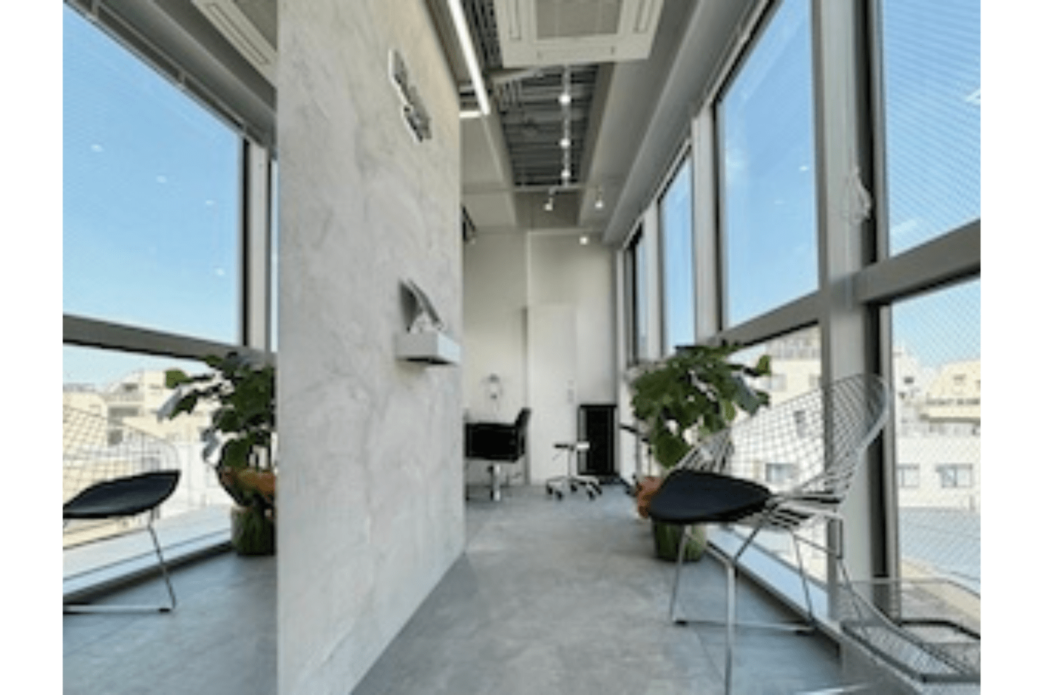 セット面の向きも特徴的だと思います。通常は壁側に鏡や椅子を設置することが多いのですが、壁に対して垂直に配置して半個室にしました。そうすると鏡に余計なものが映り込まず、お客様は自分の髪型を見やすいですし、人目も気になりません。担当する美容師側もお客様の髪を見やすいんです。
