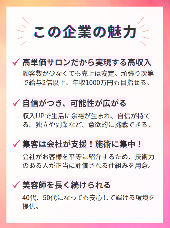ただ低価格帯サロンと比べると、その倍くらいの価格帯になるので、お客様が半分になったとして売上はそのままキープできるわけです。またそこから地道にお客様をリピートさせることができるようになれば、売上がどんどん上がっていきますし、それに伴ってお給料も上がります。給料が以前働いていたサロンの倍になったという人も少なくありません。