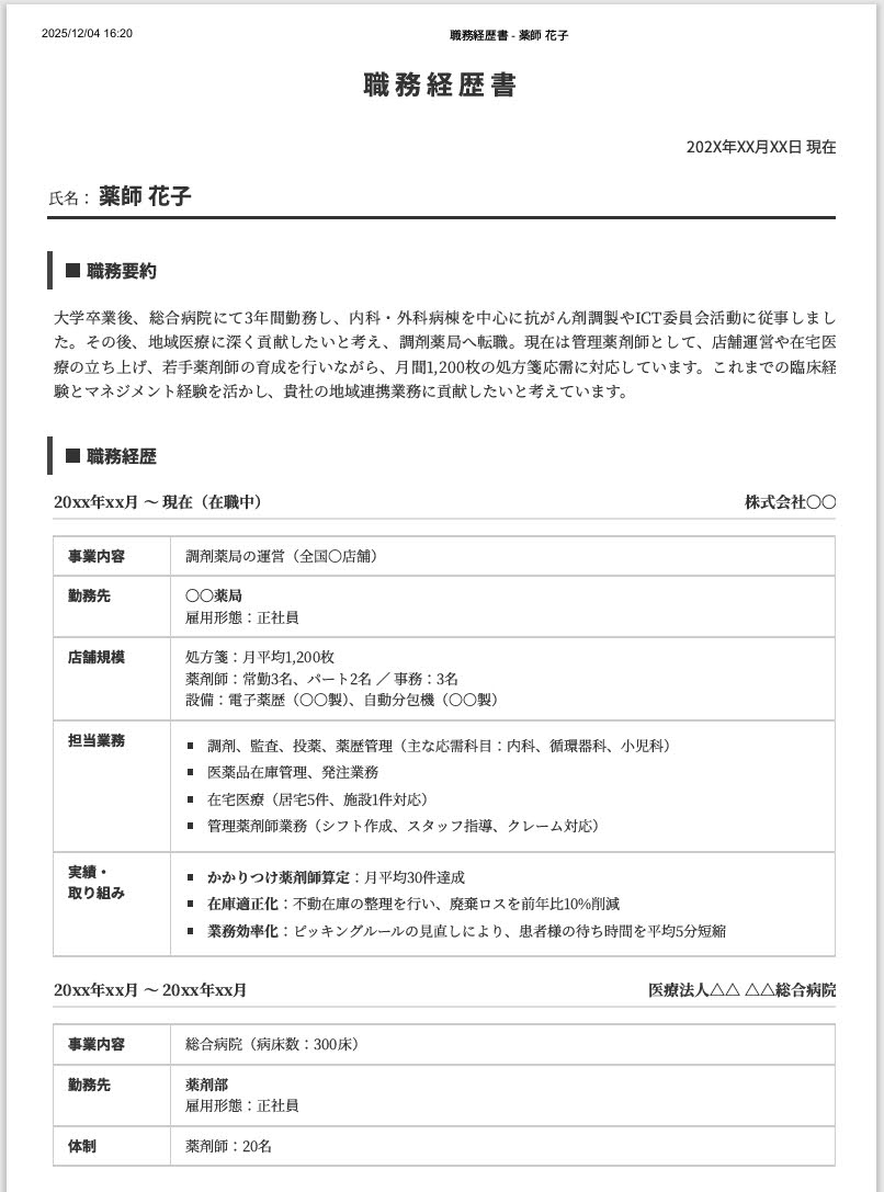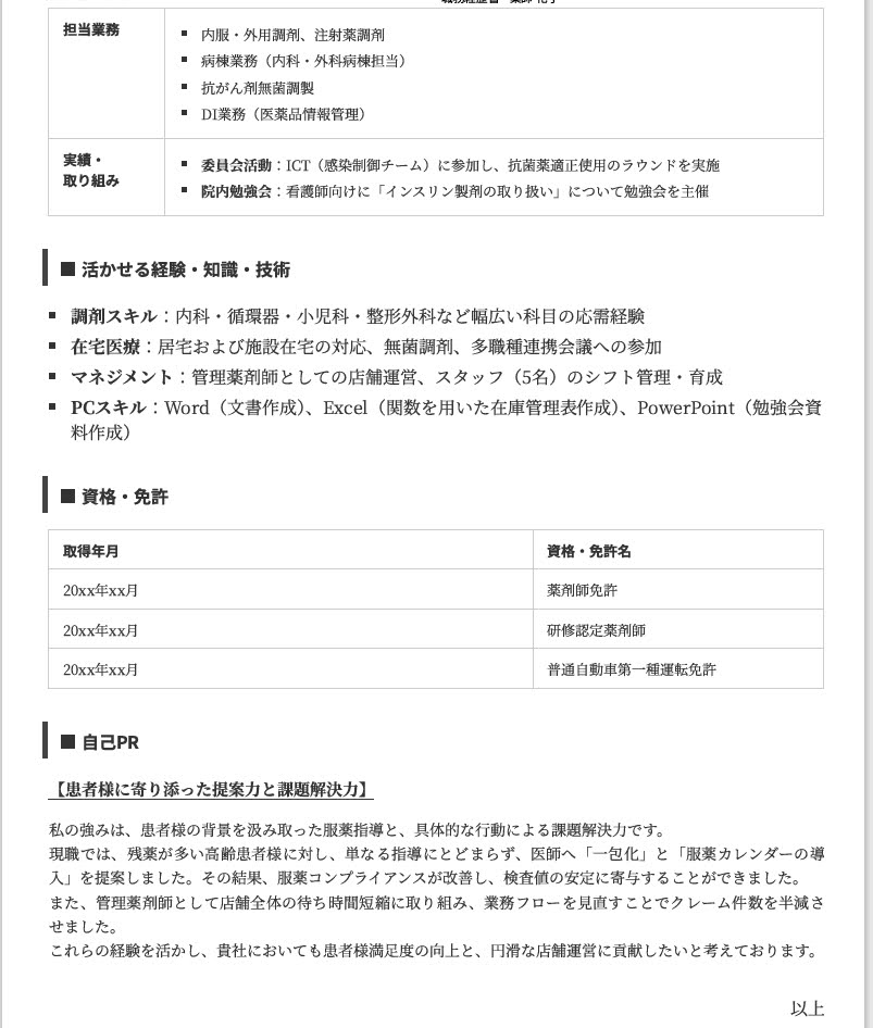 ・職務経歴書 △△薬局にて、内科・小児科を中心に月間1,500枚の処方箋を応需。管理薬剤師としてスタッフ5名のマネジメントに従事。