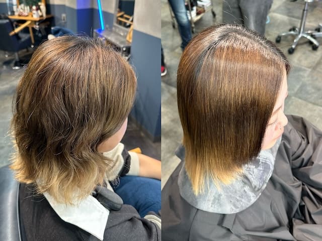 ブリーチ毛に対する縮毛矯正です。薬剤選定・塗布・放置などの工程を、科学的根拠をもとに完全固定マニュアル化しているので、どんなダメージ毛にも対応できます。