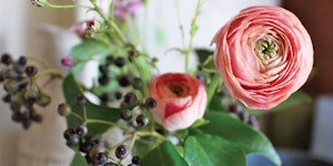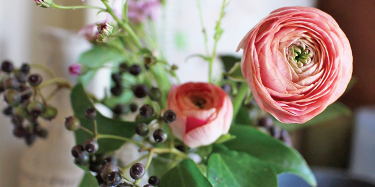 グラスにラナンキュラスを中心に、実のついたヘデラベリー(左)、小花のサイネリアを組み合わせて、大人っぽい春を表現してみました。華やかなラナンキュラスは、1〜2輪でも存在感のあるアレンジにしてくれます。