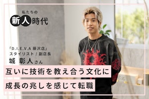 髪に悩みを持つ方をはじめ、多くのお客様から評価を得ている髪質改善に特化した「D.I.E.V.A」。関東エリアを中心に5店舗展開する、正社員と業務委託のハイブリッドサロンです。その神奈川・藤沢店でスタイリストとして働くのが、入社2年目の城彰人さんです。