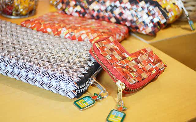 ecomismo(エコミスモ)はお菓子の袋をリサイクルしたオリジナル商品。フィリピンのお母さんたちがひとつひとつ手作りしているので、あなたの選んだエコミスモは、世界にひとつだけ!軽くて丈夫で、なによりとってもカラフルで可愛いんです。