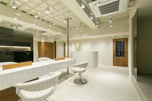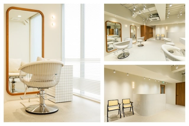 席の間隔を広めに取ってゆったりとした空間を作り、なるべくお客様同士で目が合わないような配置にして、リラックスできるようにしています。全体的に白を基調としているのですが、壁は真っ白ではないんです。髪の色はきれいに見える照明でありながら、壁に反射した光は柔らかく感じられると思います。