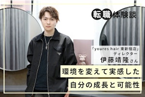 今回は、「youres hair 東新宿店」でディレクターとして働く、入社1年目の伊藤靖隆さんにインタビュー。前編では、最初の就活や2社目に転職した経緯などについてお話をお聞きしました。