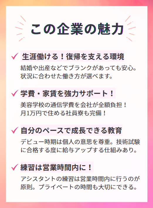 大きなものでいうと、スタッフ向けに美容学校の通信学費を全額負担しています。また、社員の費用負担が月1万円の社宅を完備しているので、アシスタントでも比較的、生活を安定させやすいです。