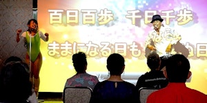 カラオケ館銀座総本店のパーティールームには、招待された高齢者や関係者など約100人ほどが集まりました。座ったままできる「カラフィット」のために、適度に間隔を空けて置かれた椅子は満席状態。開発者の周防さんの挨拶でイベントはスタートしました。