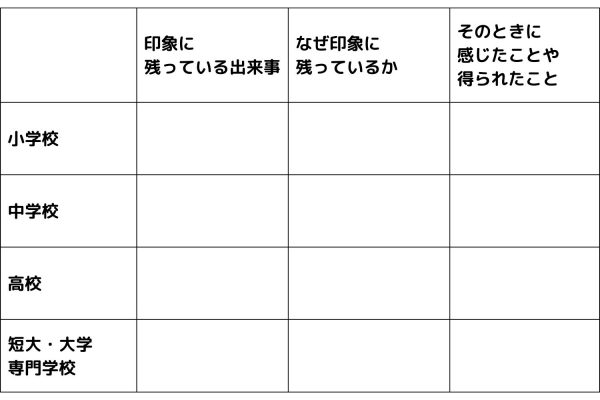 「自分史」を使った自己分析のやり方を紹介します。次表のようなフォーマットを作り、空欄を埋めていきましょう。記入することは、自分や自分の身の回りの出来事(部活・勉強・家族との出来事・クラスで起きたこと・友人関係など)です。