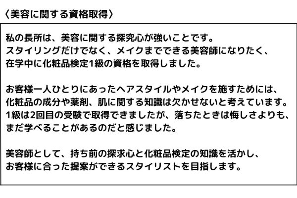 他人の身だしなみに関わる美容師が、履歴書で「汚い」印象を与えるのは得策といえないでしょう。自己PRは少ない要素でいいので、200字前後ほどの丁寧な文章で書くようにしましょう。