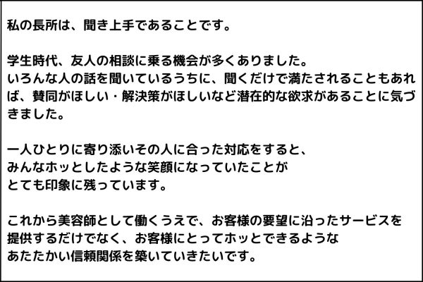 長所について述べたあと、その長所がどう活かせるのかを含めて、美容師としてどのように貢献したいかを伝えます。将来像を明確にしておくことで評価につながるでしょう。