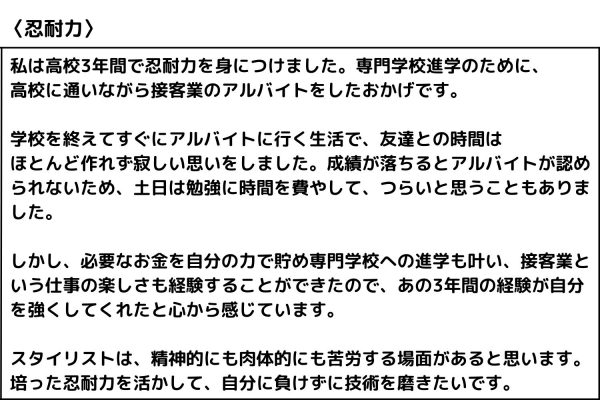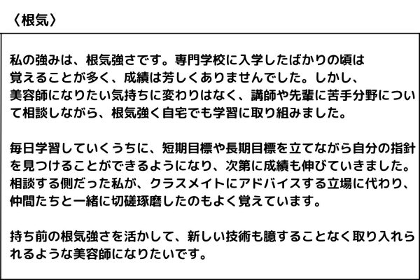 自己PRは履歴書だけでなく、面接も踏まえておくのが肝心です。特に「志望先への適性」を伝えられると会話が弾みます。たとえば「静かなムード」を売りにしている美容院に志望しているのに「快活さ」をアピールしても、大きな武器にはなりません。「真面目さ」「ひたむきさ」などの長所の方が喜ばれます。
