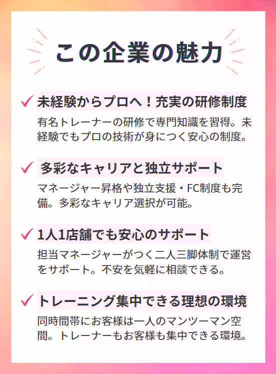 スキルアップを目指しやすいところです。配属後トレーナーも参加できる研修が月に1回以上実施されていて、そこでは社内研修だけでなく、外部講師を招いて行う社外研修もあります。業界で有名なトレーナーやボディビルダーの方が講師を務めることもあり、深い技術や知識を学べるので着実に成長できるんです。