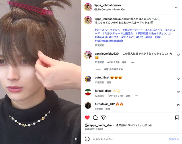 お家でも簡単に再現できて、キメたいときはすぐにカッコよくなれるスタイルがいいと思っているので、「ノーセット」でもキマるシースルーマッシュやセンターパートなど、少し長めのスタイルを推しています。骨格に合わせてカットするので、面長でも丸顔でも、どんな顔型の方にも似合わせやすいスタイルなんです。