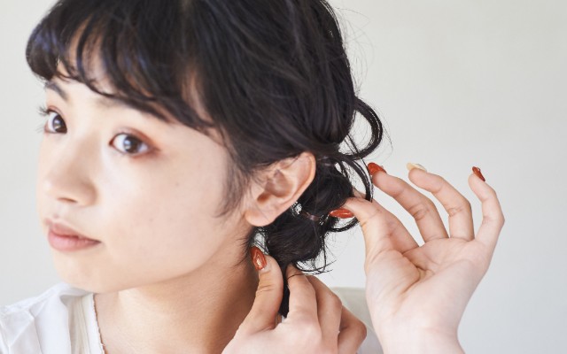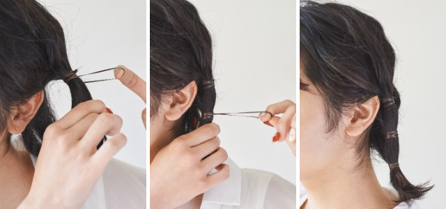 片サイドの耳より上の髪を結ぶ。結んだ髪に、耳下あたりまでの髪を足して、2段目を結ぶ。残った襟足の毛もまとめて、3段目を結ぶ。逆サイドも同様に。