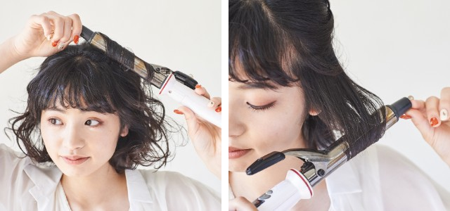 ハチより上の髪を、ヘアアイロンで根元からしっかり巻いていく。ハチ下の髪は毛先に動きが出るように、毛先を1回転巻く。
