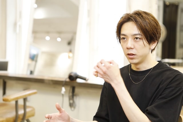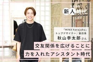 サロンワークのみならず、メディア出演や国内外のカットセミナー、ヘアショー公演なども行う「MINX」。予約サイトにて美容室の人気ランキング1位も獲得する、美容業界の第一線を走るヘアサロンです。その原宿店でトップデザイナー・副店長として働くのが、入社9年目の秋山拳太郎さん。