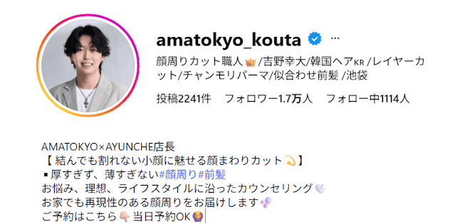 2025年には「AMA TOKYO」へ入社し、「AMA TOKYO × AYUNCHE 」の店長に就任。お客様1人ひとりの悩みに寄り添いながら、再現性の高いヘアスタイルを提供している。インスタグラムのフォロワー数は1.7万人を超える。