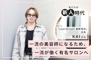 今回は、「youres hair 東新宿店」で店長として働く、入社5年目のKAIさんにインタビュー。前編では、美容学生時代やキャリアのスタートとなったサロンでの経験について伺います。