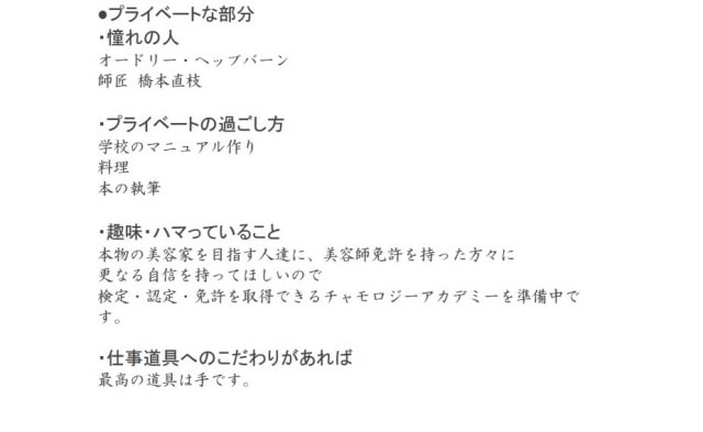 シャンプーしかできないのはつまらないので、色々な先生のアシスタントに入って見て学ぼうと思ったんです。カットの先生につくときには、「この先生の利き手はこっちだから道具をこういう風に手元に持っていけばやり易いだろうな」などと気を利かせていたから、次から指名が入るわけですよ。その他にもネイル、フェイシャルのアシスタントにも入りました。着付けのアシスタントをしていたときには、誰もやりたがらない男性の紋付袴の着付けを率先してやったりしてね。自分が日本男性の紋付袴姿が好きっていう理由もあったんですけど…(笑)。先生には「あんたは変わってる」と喜んでもらえて。そんな風に自分から動いて全部マスターしたんです。私がどんどんアシスタントに呼ばれるものだから周りからは嫉妬されちゃって。でも、やらないならしょうがないですよね。私に向かって嫉妬されても困りますって感じよね(笑)。