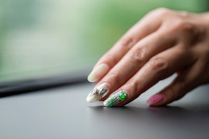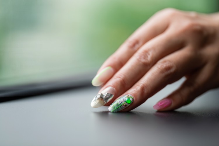 これから夏に向けておすすめなのが、ボタニカルな印象のリーフ柄。リゾート感もあって、爽やかなので夏の指先にぴったり。あと、スポーティなファッションが流行っているので、そんなニュアンスを感じるデザインは要チェック。蛍光カラーのラインや、PVCっぽい質感にメタルカラーを取り入れると、スポーティで旬な仕上がりになります。