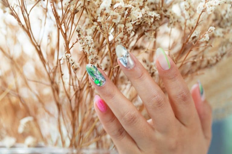 ハンドペイントではなく、シートを埋め込んで作っているリーフ柄。素材を使っているから、グリーンでもほっこり感のないクールな雰囲気に。蛍光グリーンのラインがアクセントになり、スポーティでファッショナブルな指先が完成します。