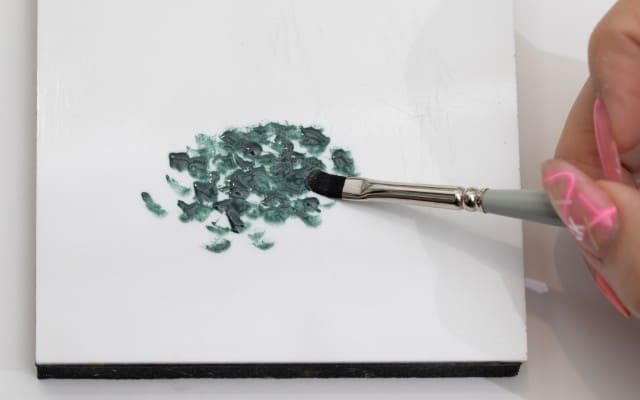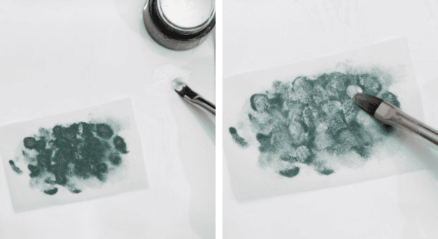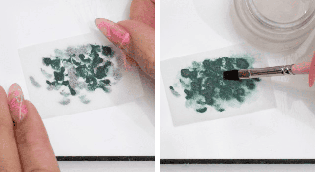 つるんとしたボードの上に、濃い緑のカラージェルをのせる。筆を使い、隙間ができるようにポンポンと。