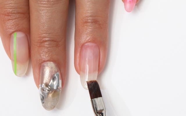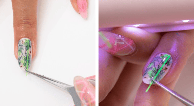 ミキシングクリアジェルを薄く塗り、蛍光グリーンの直線ジェルシートをのせる。浮きやすい爪先をピンセットで押さえながら、ハンディライトを当てて硬化。