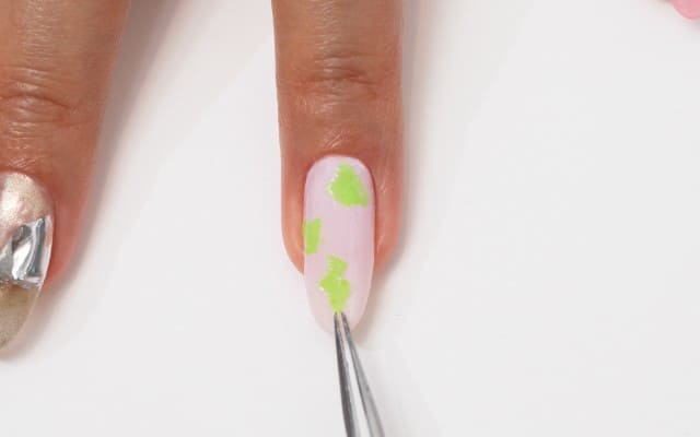 ミキシングクリアジェルを薄く塗り、蛍光グリーンのジェルシートをランダムに3ヵ所ほどのせる。一度ライトを当てて完全硬化。