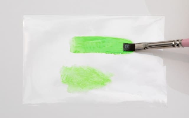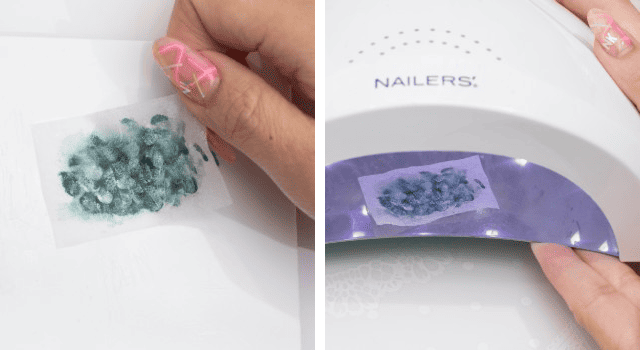 クリアシートに、蛍光グリーンのカラージェルをのせる。1つはムラが出ないように薄めにのばし、もう1つはムラが出るように極薄くのばす。ライトに20秒当てて完全硬化。