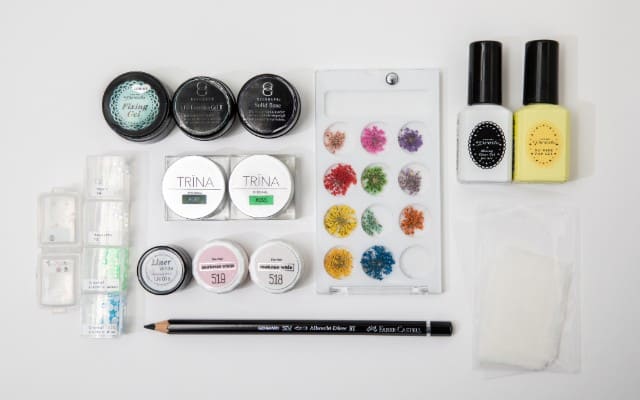 トップジェルコート、ミキシングクリアジェル for art、クリアベースジェル、エクステンションジェル、フィキシングジェル、カラージェル(モスグリーン、蛍光グリーン、マットホワイト、濃いピンク、薄いピンク)、花、ストーン、クリアシート、ティッシュペーパー、デッサンペン