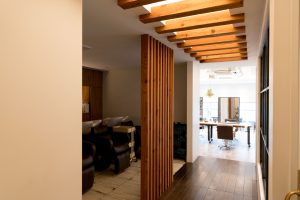 「住居をイメージした空間を作りました。一番落ち着ける場所を考えたときに、誰もが自分の家がもっともリラックスできると思ったからです。そこでまず、エントランスにあたるスペースを作りたいと思い、受付の前を少し広めにとっています。またカットスペースに向かう途中に木製の通路を作ったこともこだわったポイントです。ちなみに店内の木目の部分も、飾っている植物もすべて本物の木を使っています。床のレンガも本物です。一流の人がいらっしゃいますから、そういった細かな部分にこだわっていなければ満足してもらえません。また、本物の木を使うことで日々の仕事の軌跡が味わいに変わり、年数を重ねるごとに魅力的なサロンに変わります」