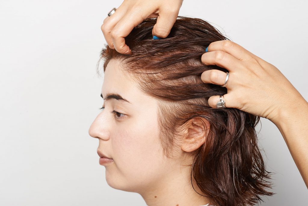 オイルとバームを1:1で混ぜて手全体にのばし、生え際からなじませて顔周りもしっかりクセを出す。