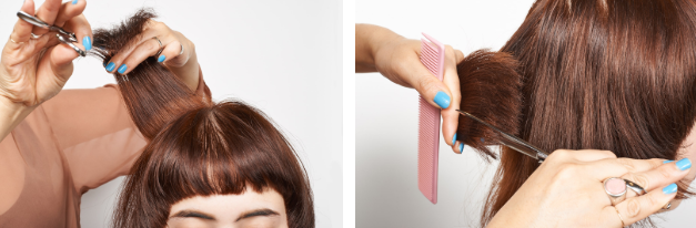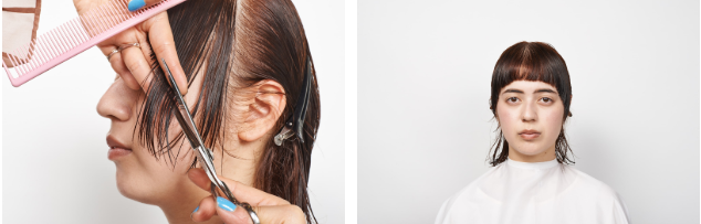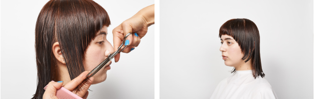 両サイドを残して、黒目幅で分け取る。左右対称になるように、平行にカット。
