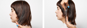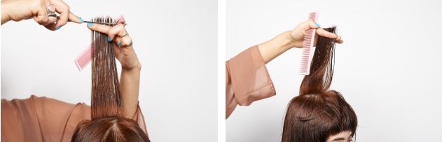 ハチから耳上(セクション2)は、頭に対して60度でパネルを引き出す。ベースに厚みが残るように、刃先を外に外しながらローレイヤーを入れる。少しずつハの字シルエットになるように意識して。