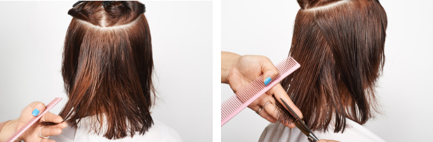 サイドとバックは、レイヤーと同じパネルの取り方でセニング。レイヤーを入れた部分の毛先1/4に、縦にハサミを入れて厚みを取る。これによりフィット感が出る。