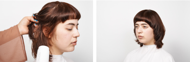 全体のかたちを作りながらハンドブロー。毛流れに沿って、少しテンションをかけながら、面にツヤ、毛先にカールが出るまで乾かす。