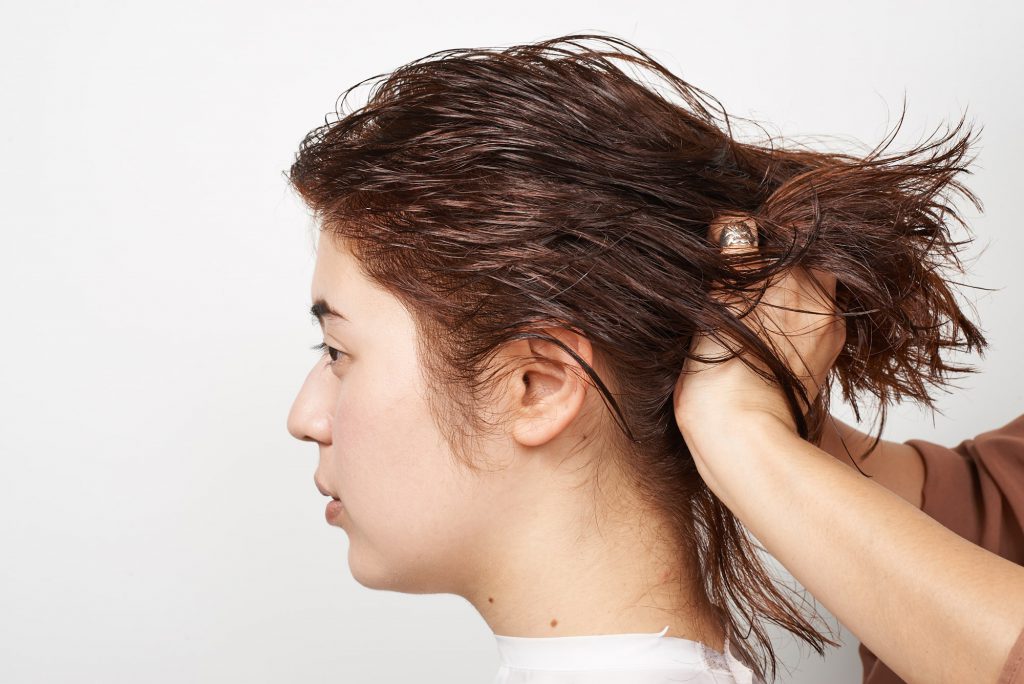 頬の高さからレイヤーが入り、サイドの毛量が少なくなった状態。クセによる髪の動きをいかしたカットを施していく。