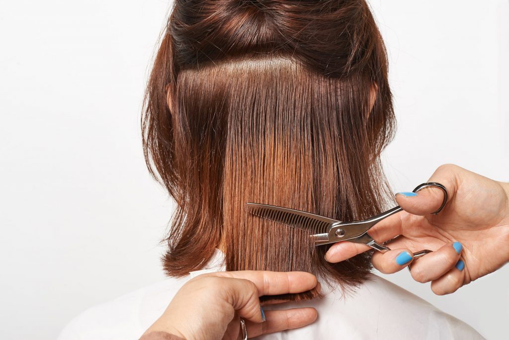 一番重さのあるアンダーは、毛先1/3から平行にハサミを入れ、スライドしながらセニング。しっかり間引き、動きを出す。